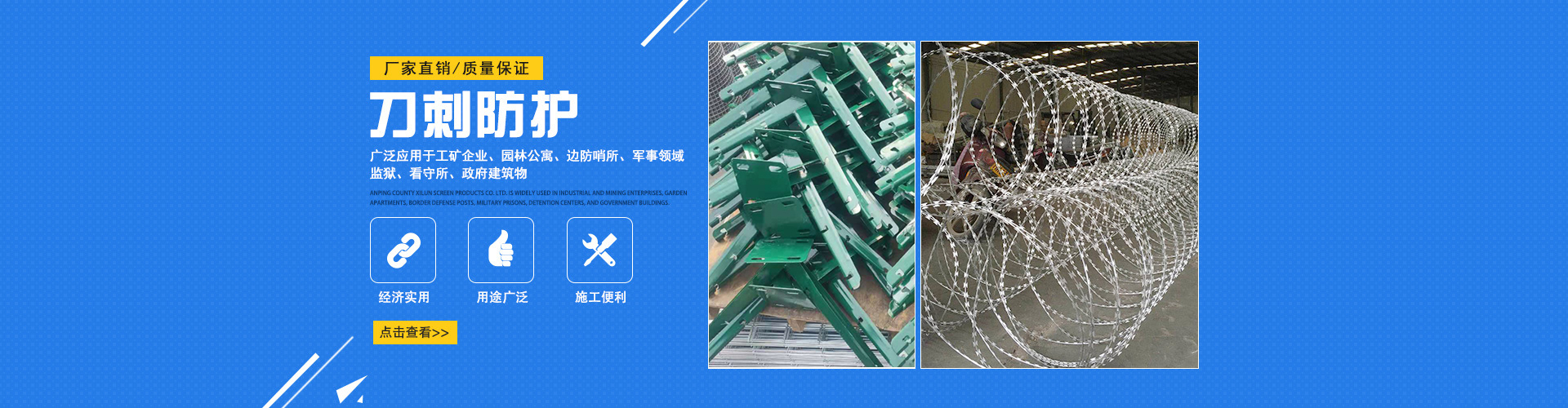 安平初日絲網(wǎng)有限公司主要產(chǎn)品有刀片刺繩、刺絲滾籠、刺繩支架、護(hù)欄網(wǎng)、隔離網(wǎng)、球場圍網(wǎng)等多種產(chǎn)品,公司擁有先進(jìn)的生產(chǎn)設(shè)備和技術(shù),以“質(zhì)量求生存,信譽(yù)謀發(fā)展”為生產(chǎn)原則,為新老用戶提供高質(zhì)量產(chǎn)品。